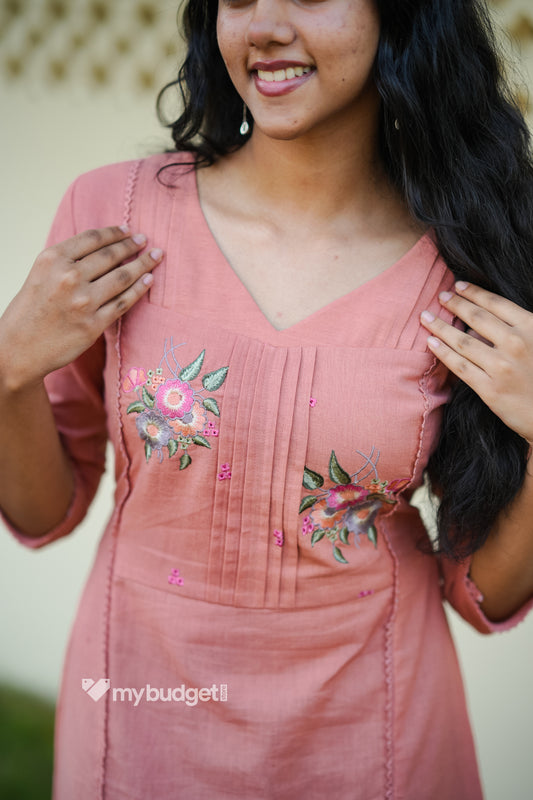 Peach shaded flex cotton A-line kurti/dress with floral embroidery detailed yoke MBS-866