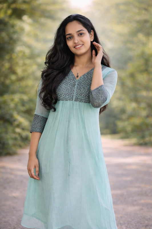 Aqua Blue soft mul cotton Alia cut Kurti with hand embroidered yoke MBS-851