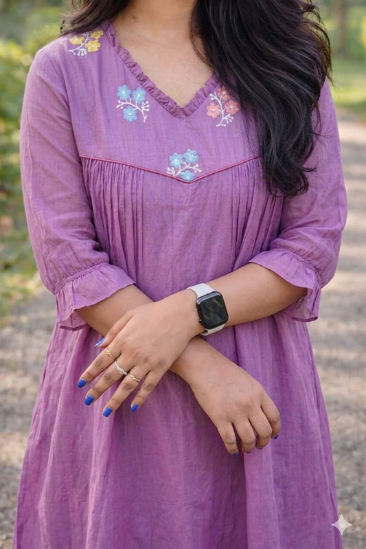 Lilac shaded chanderi Aline kurti/dress with floral thread embroidery detailed yoke MBS-878 **Ready to dispatch**
