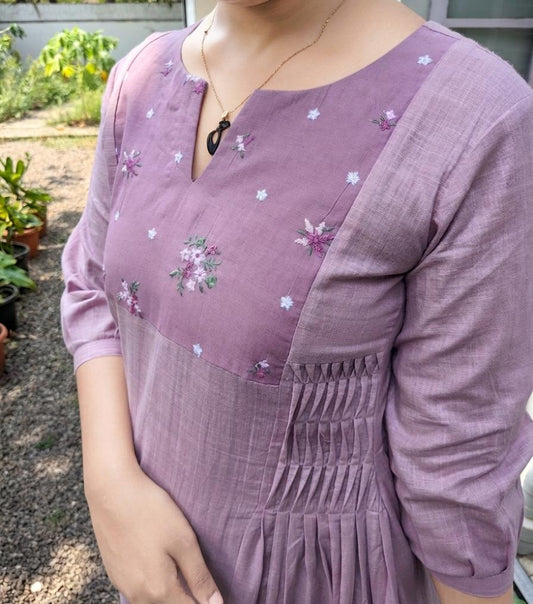 Mauve shaded slub cotton A-line kurti/dress with thread embroidered curved pleated yoke MBS-871 **Ready to dispatch**