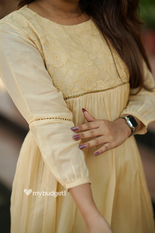 Soft beige shaded viscose organza A-line kurti/dress with floral thread applique embroidery on yoke MBS-868