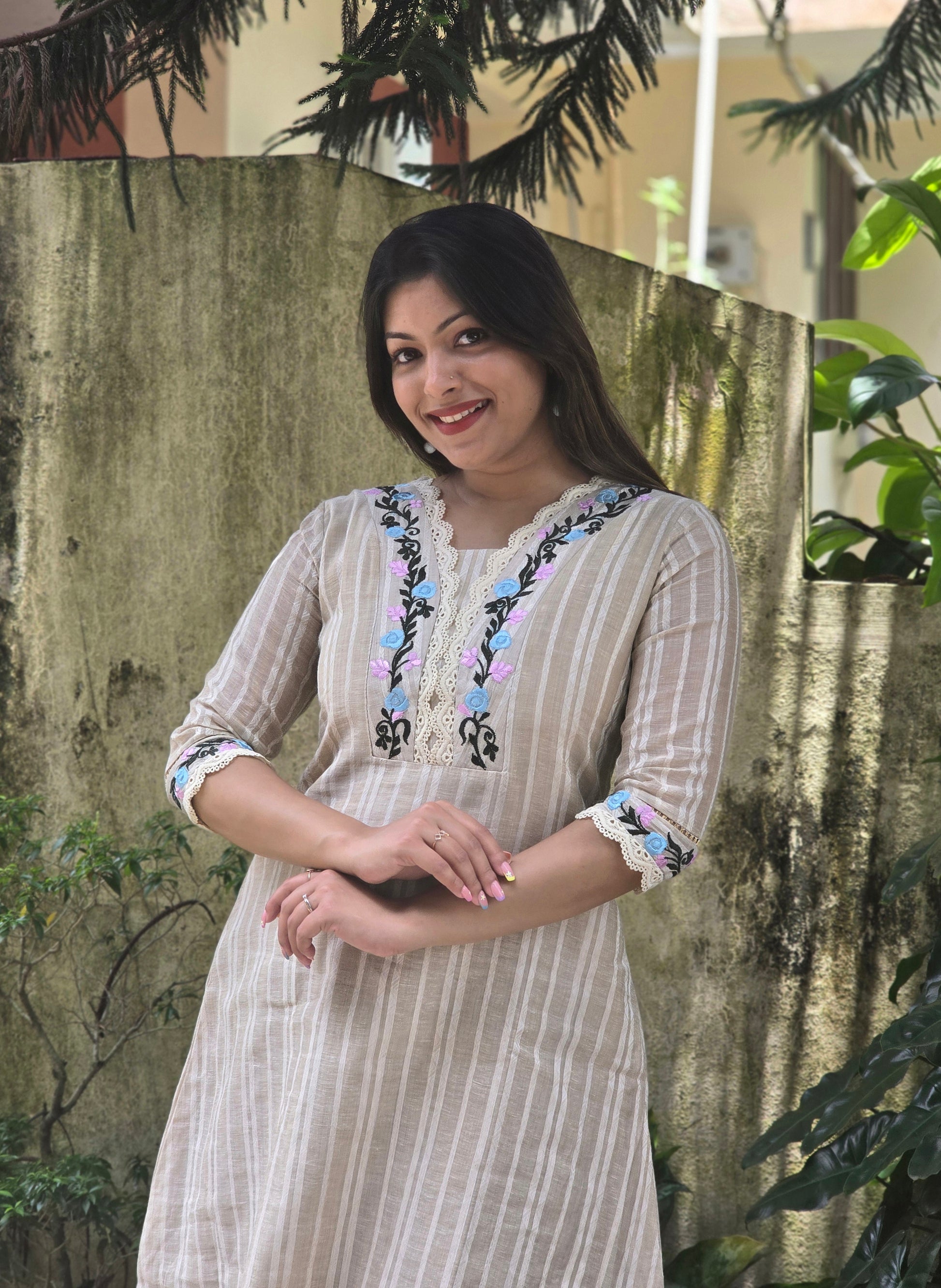 Cream shaded semi jute cotton A-line kurti with floral thread embroidered yoke MBS-763