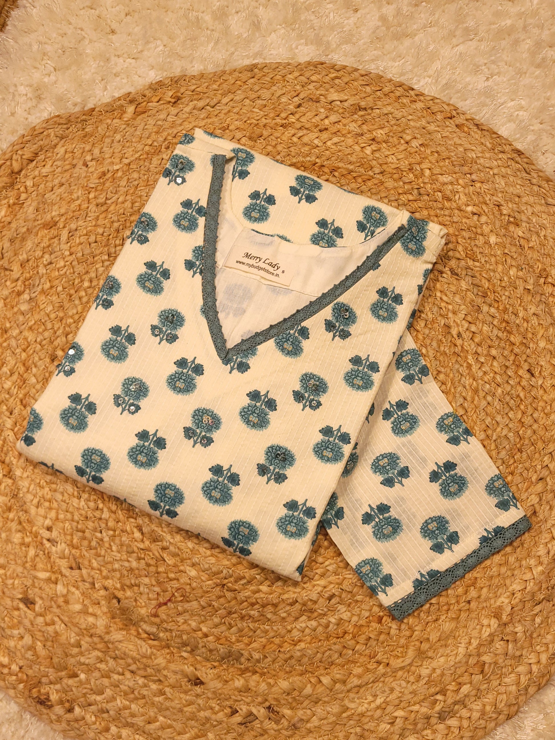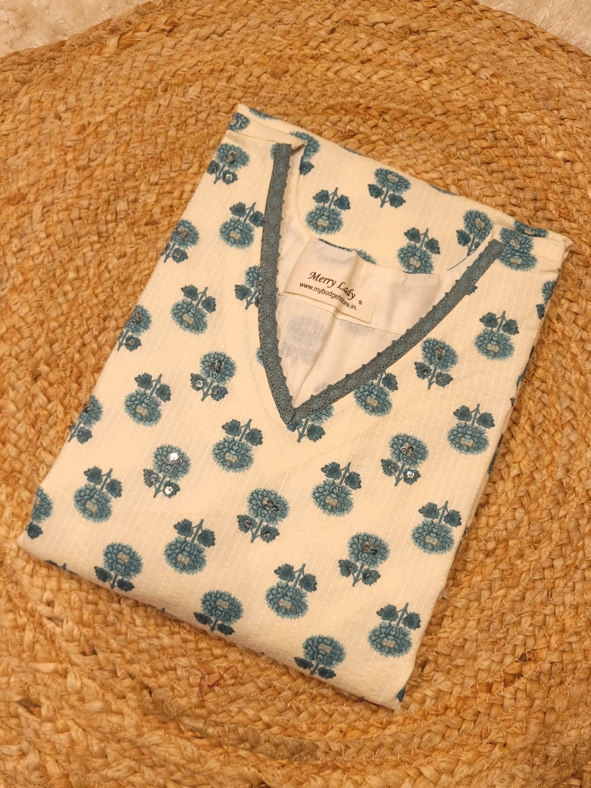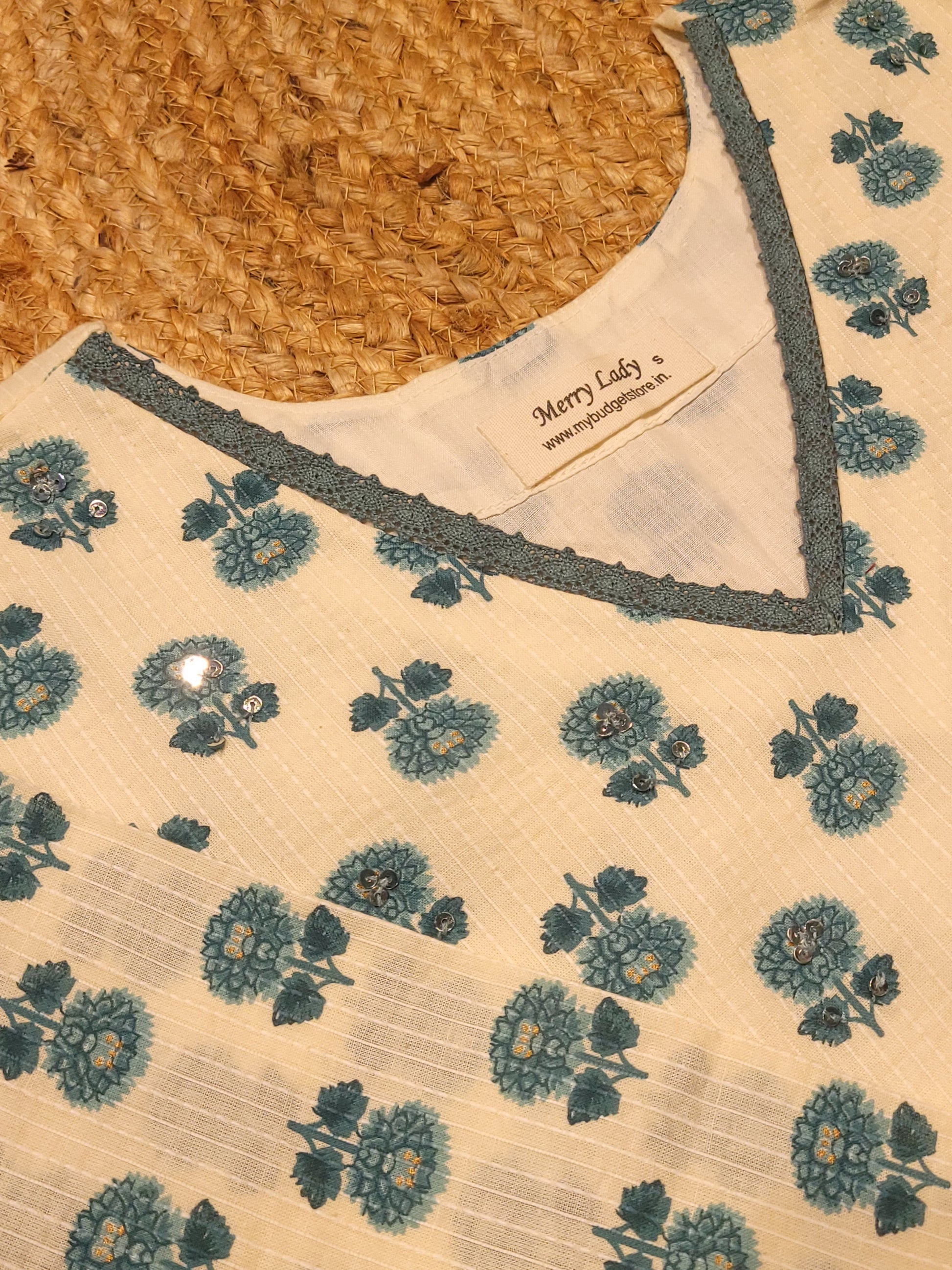 Floral printed katha cotton Aline kurti with sequins handworked yoke in offwhite shade MBS-788 **ready to dispatch**