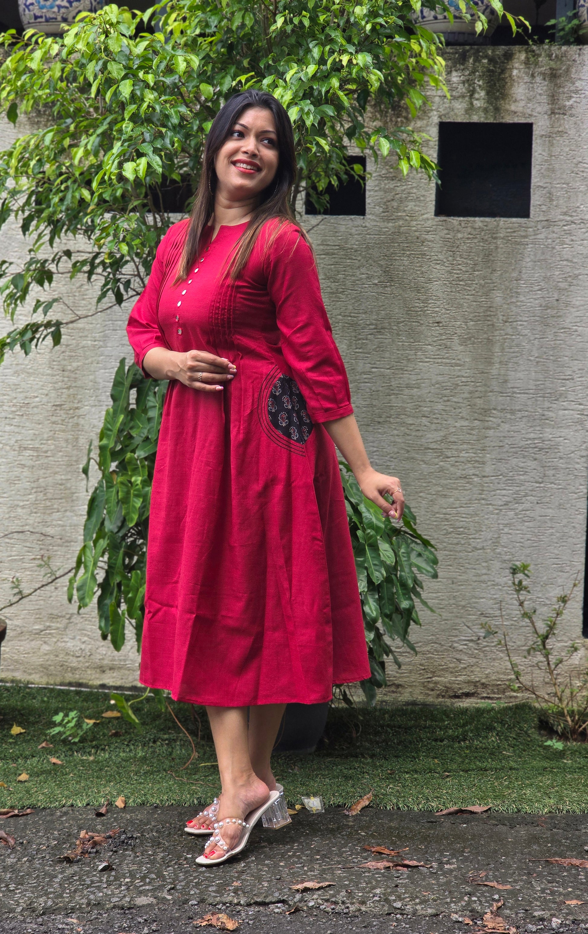 Maroon shaded cotton Aline kurti with mirror handworked yoke MBS-674