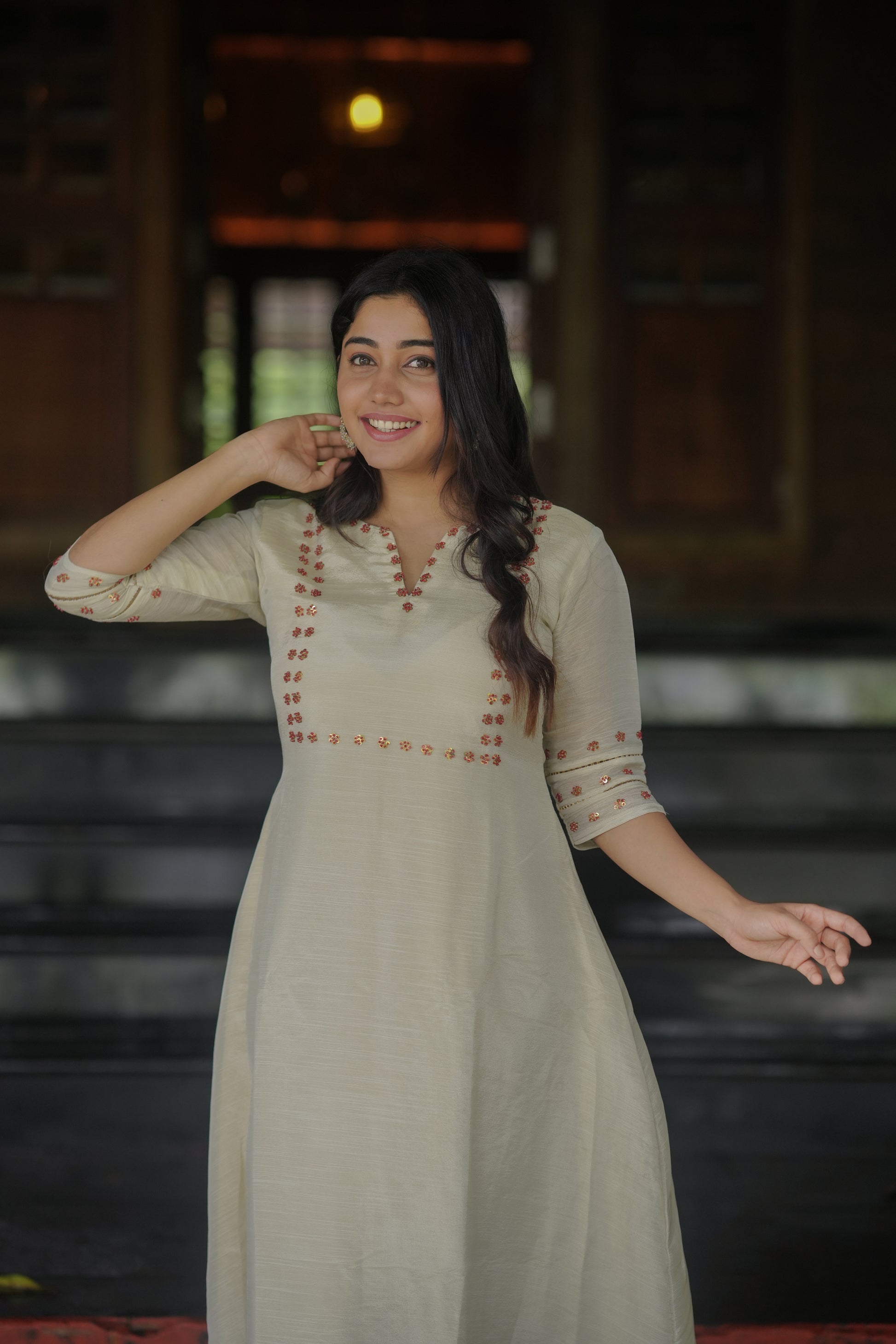 - Semi jewel neck with a V cut which is enriched with handwork detailings