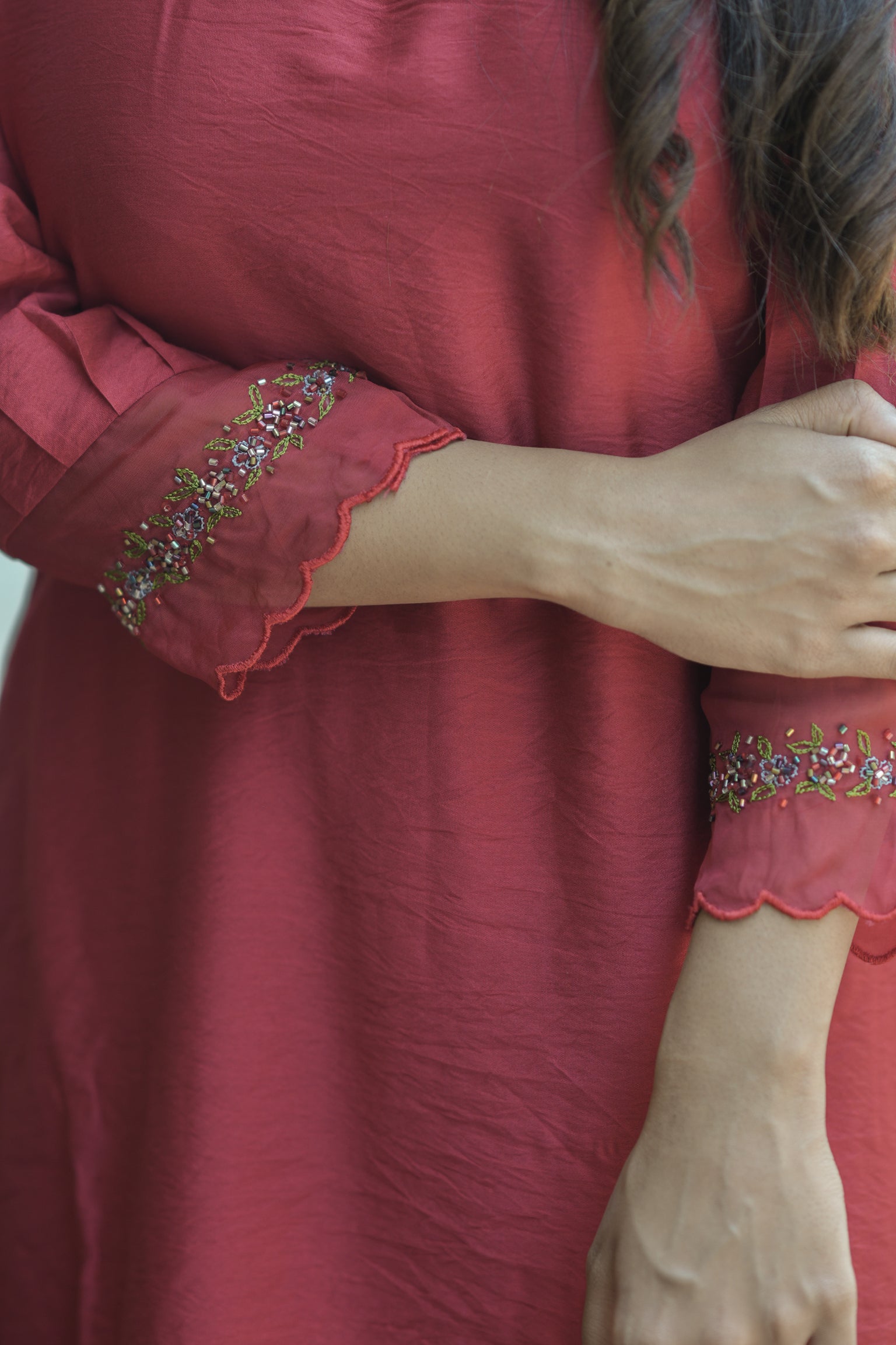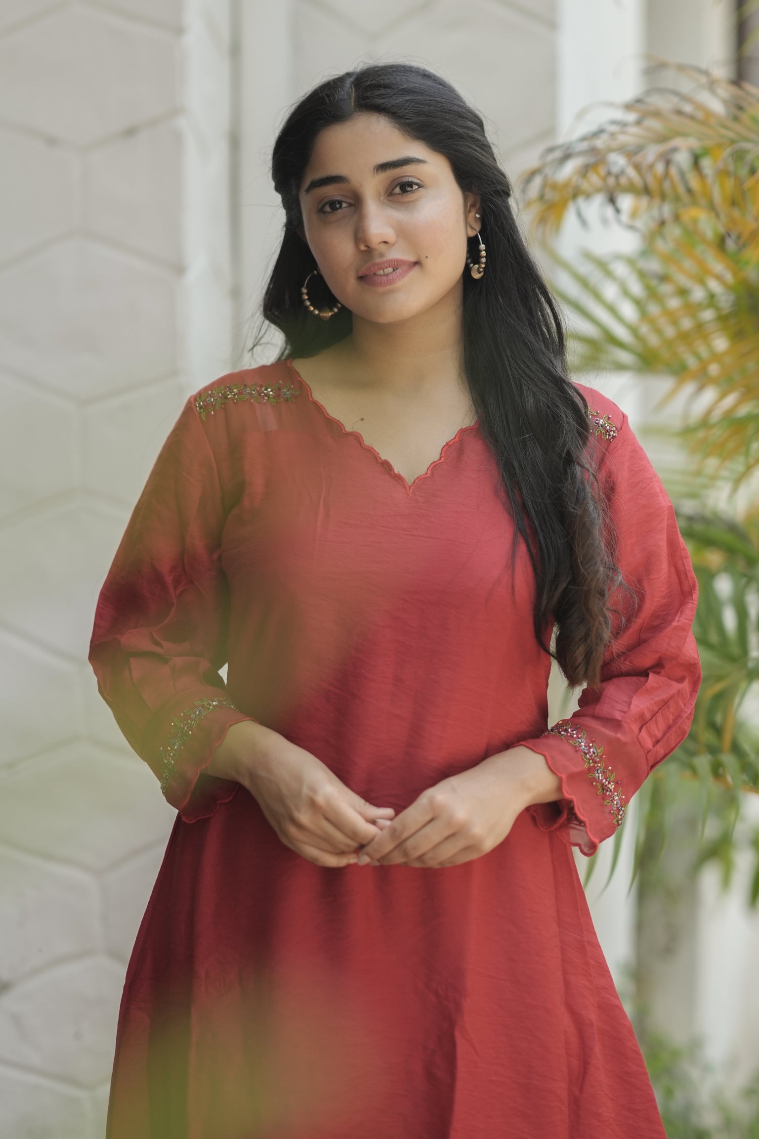Red viscose organza kurti with scalloped neckline and handwork detailings on shoulder and sleeves MBS-706