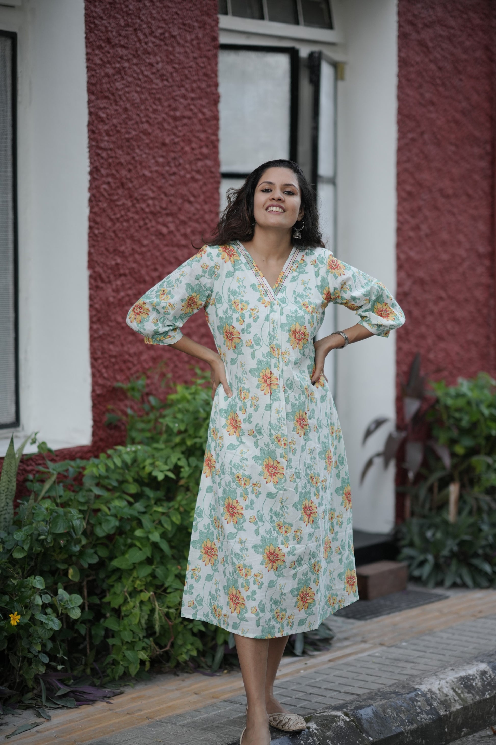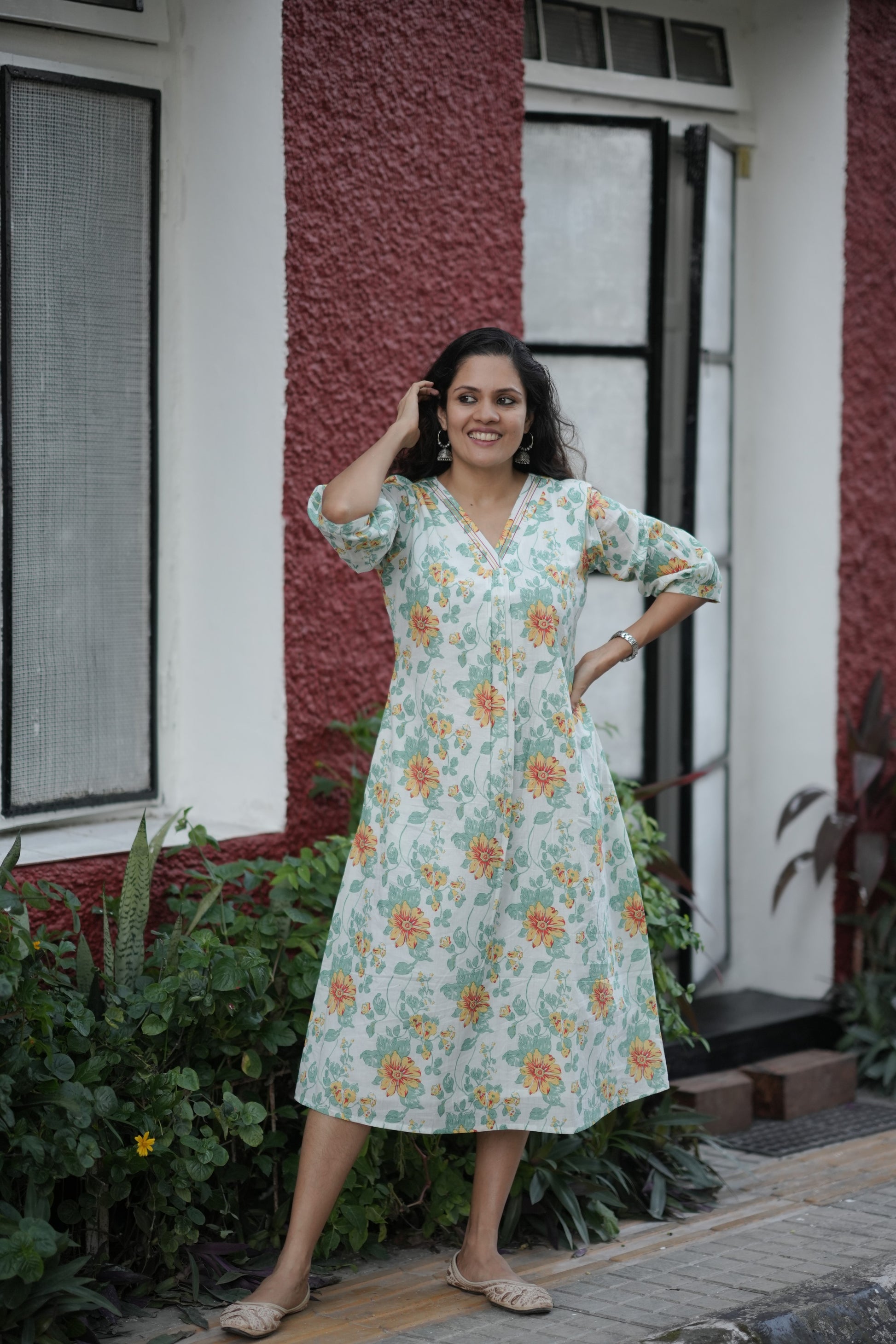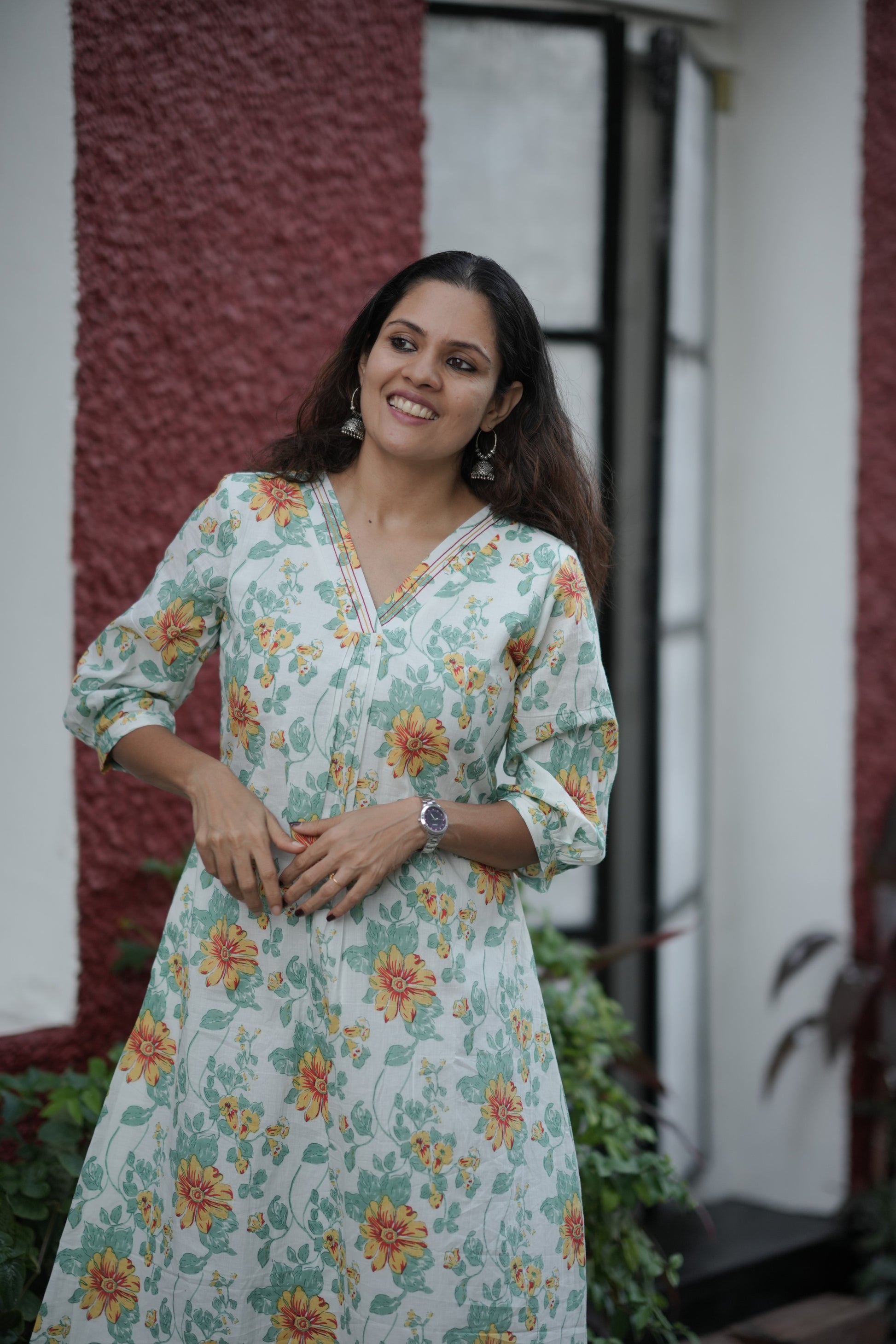 Tropical printed cotton kurti with thread detailed neckline and gathers MBS-769 ***Ready to dispatch***