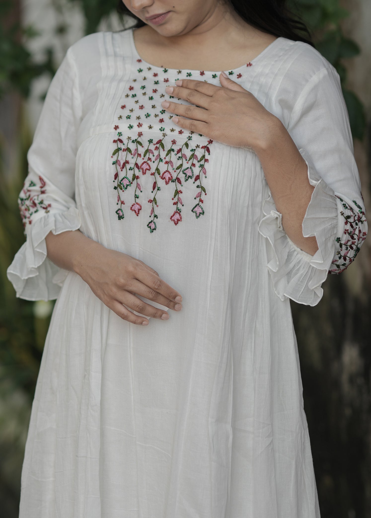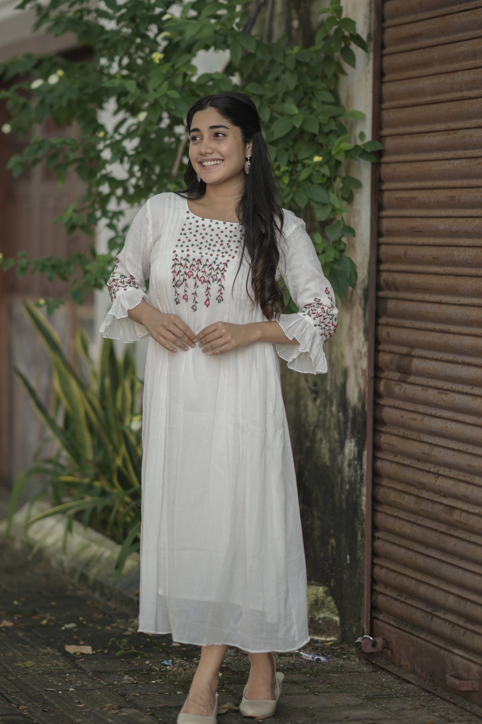 White soft pure mul cotton kurti with handworked yoke and sleeves MBS-695