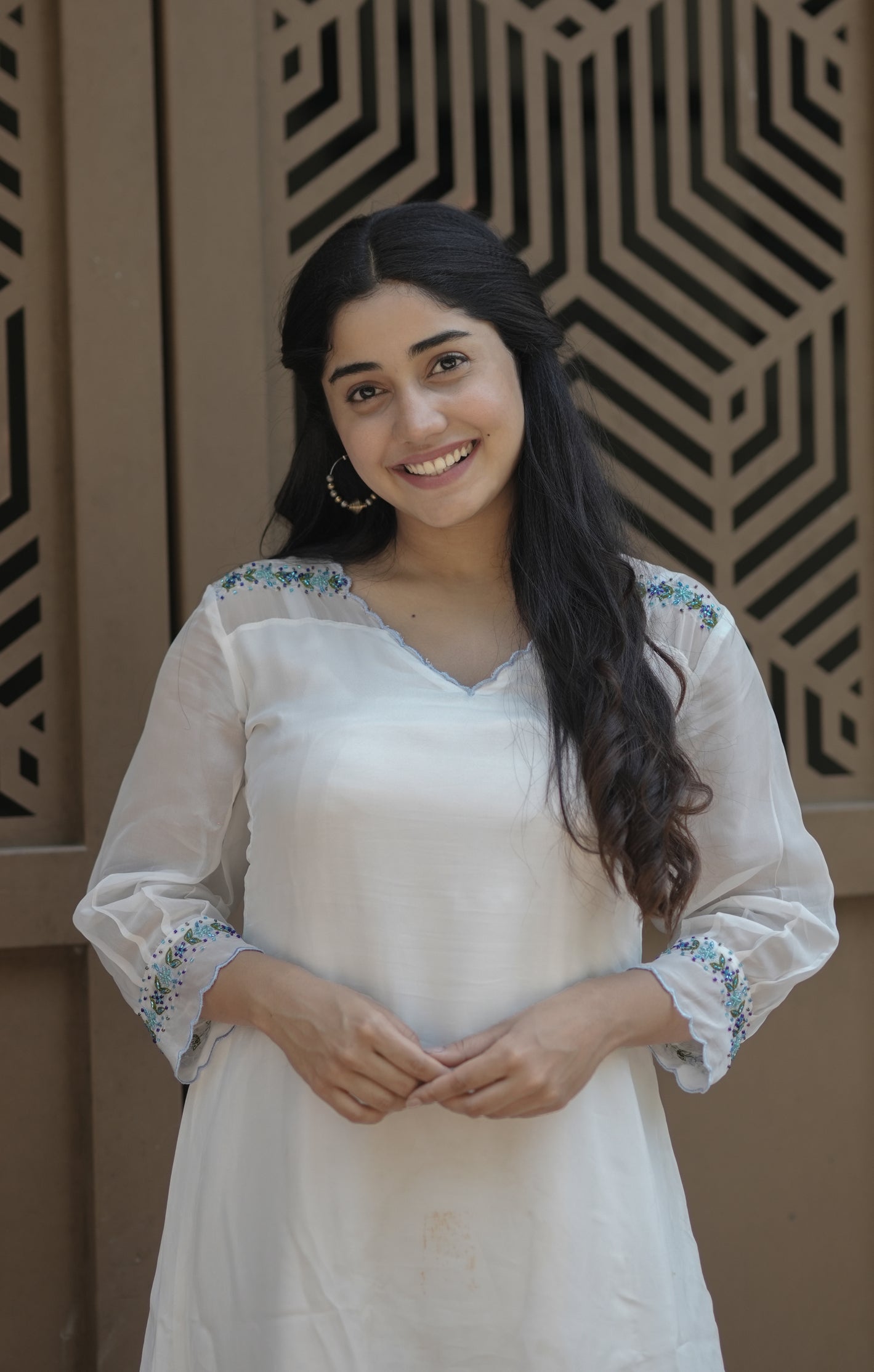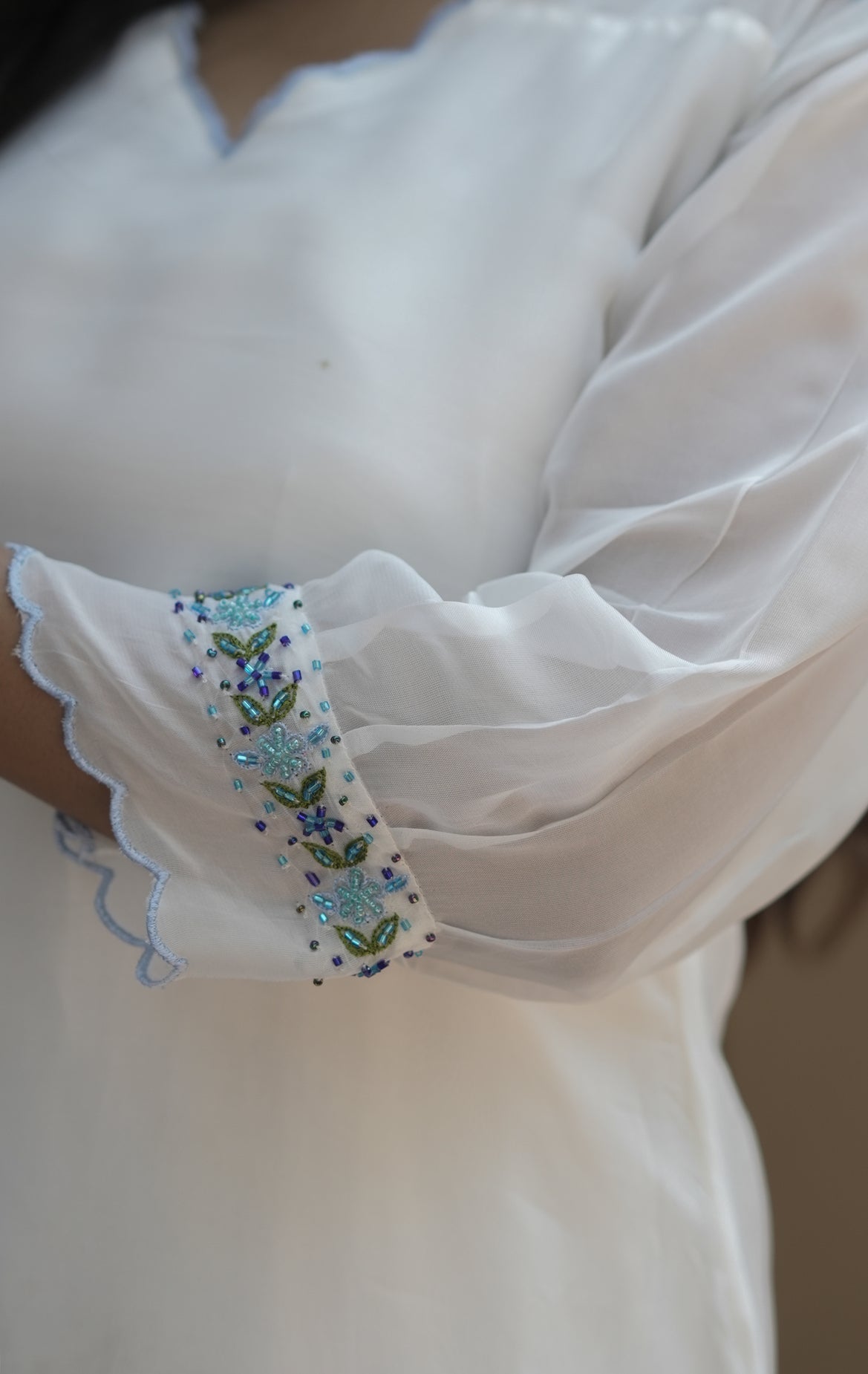 White viscose organza kurti with scalloped neckline and handwork detailings on shoulder and sleeves MBS-705