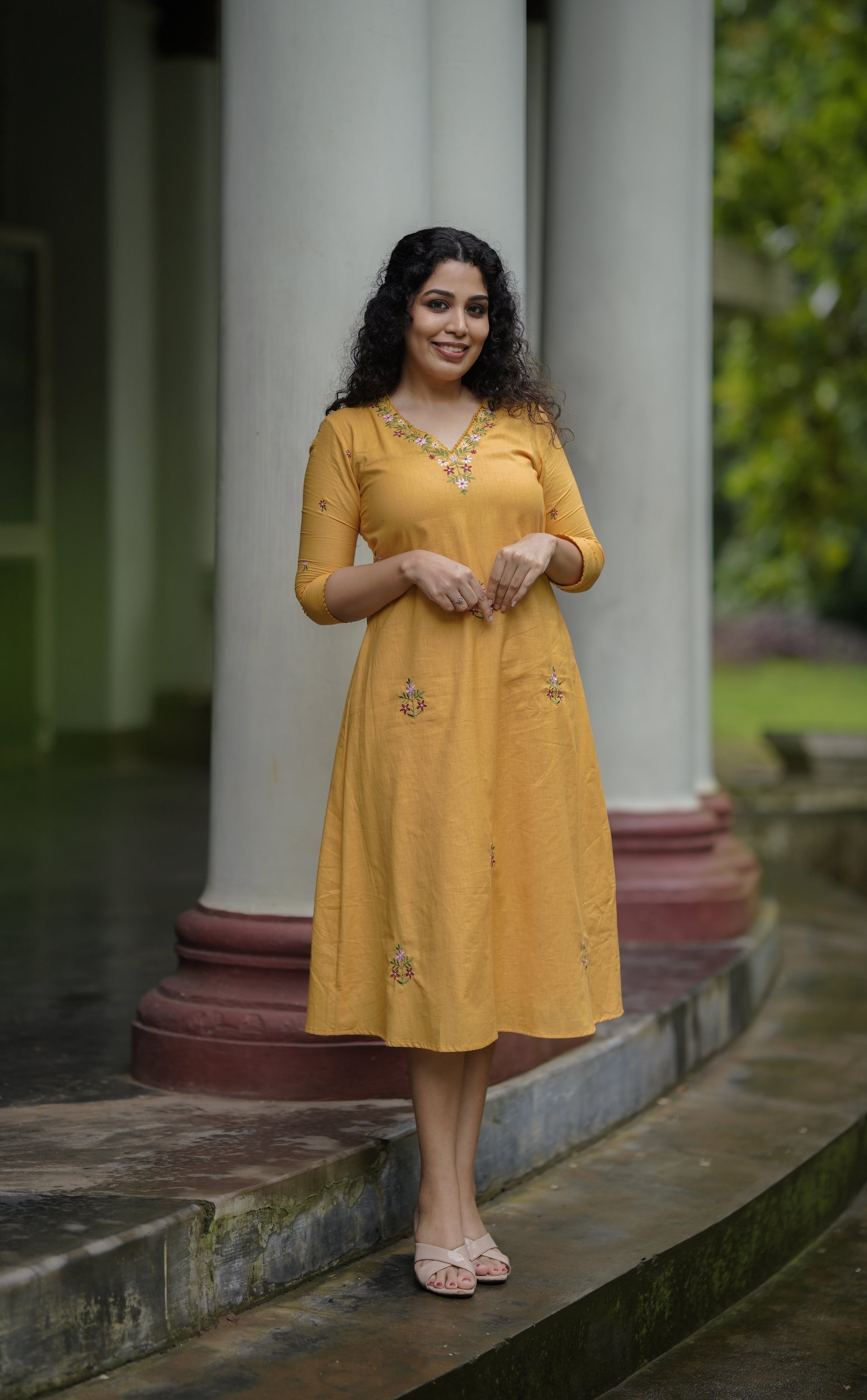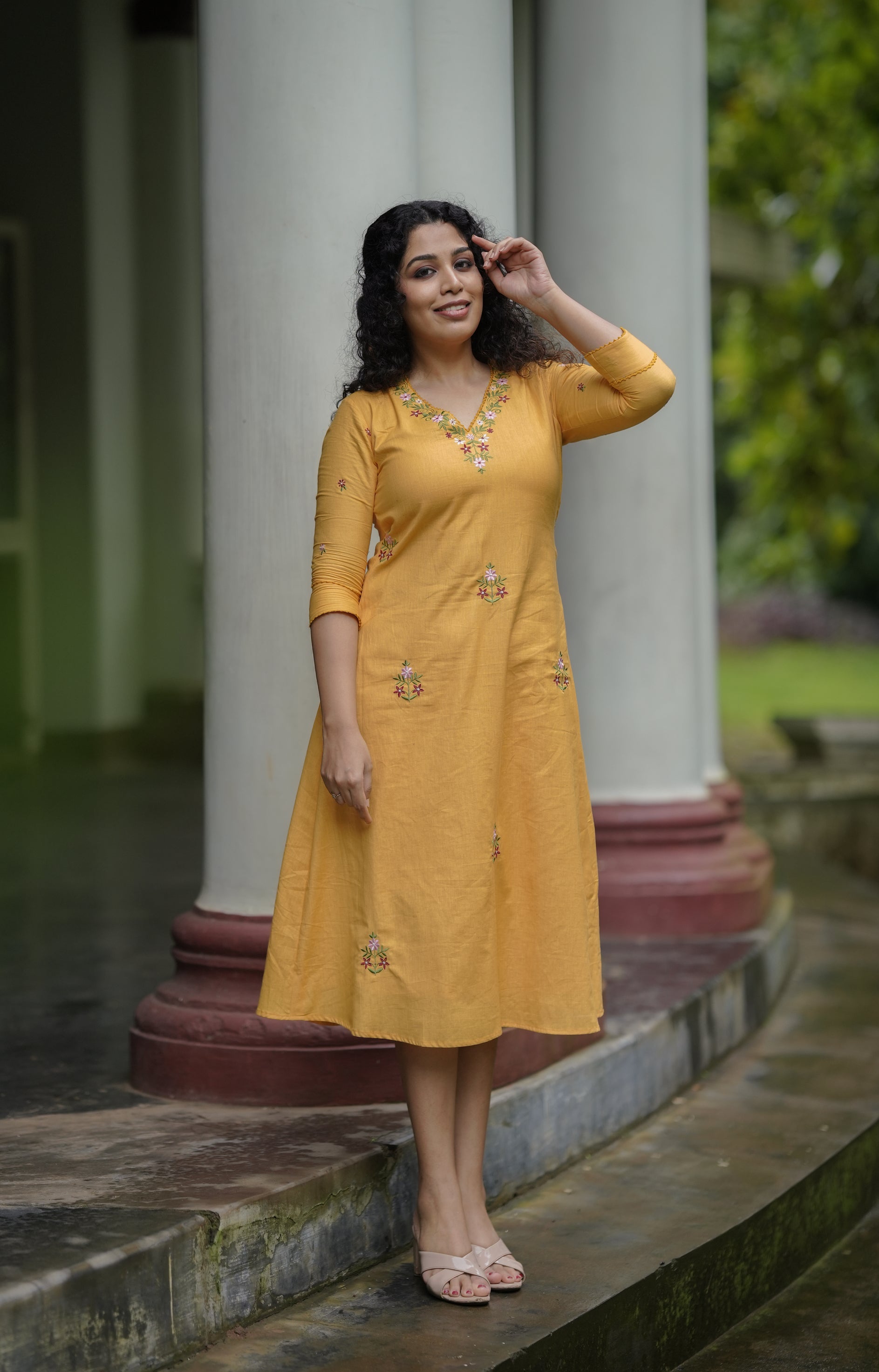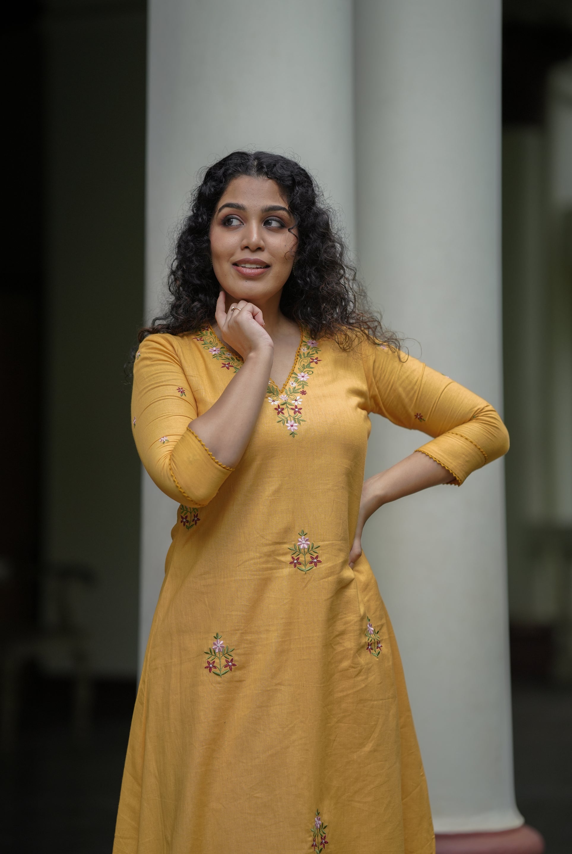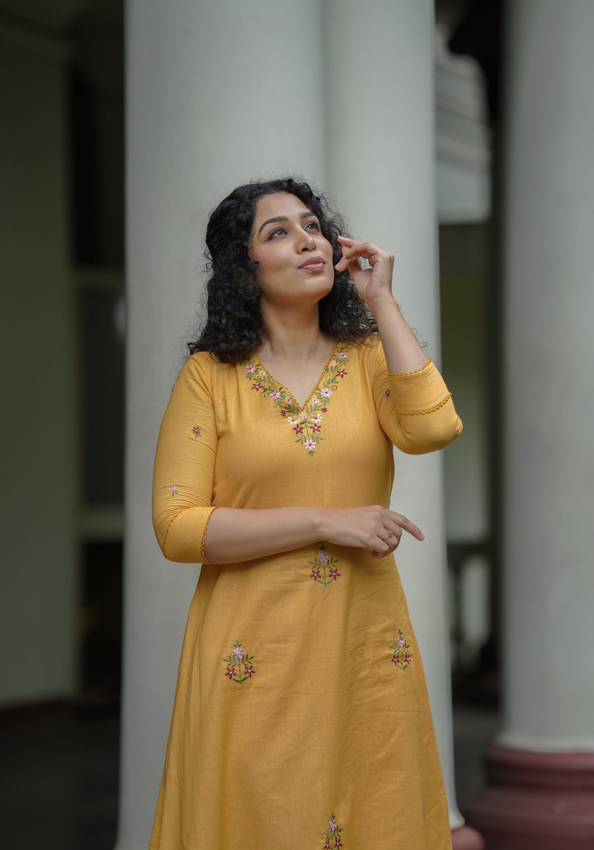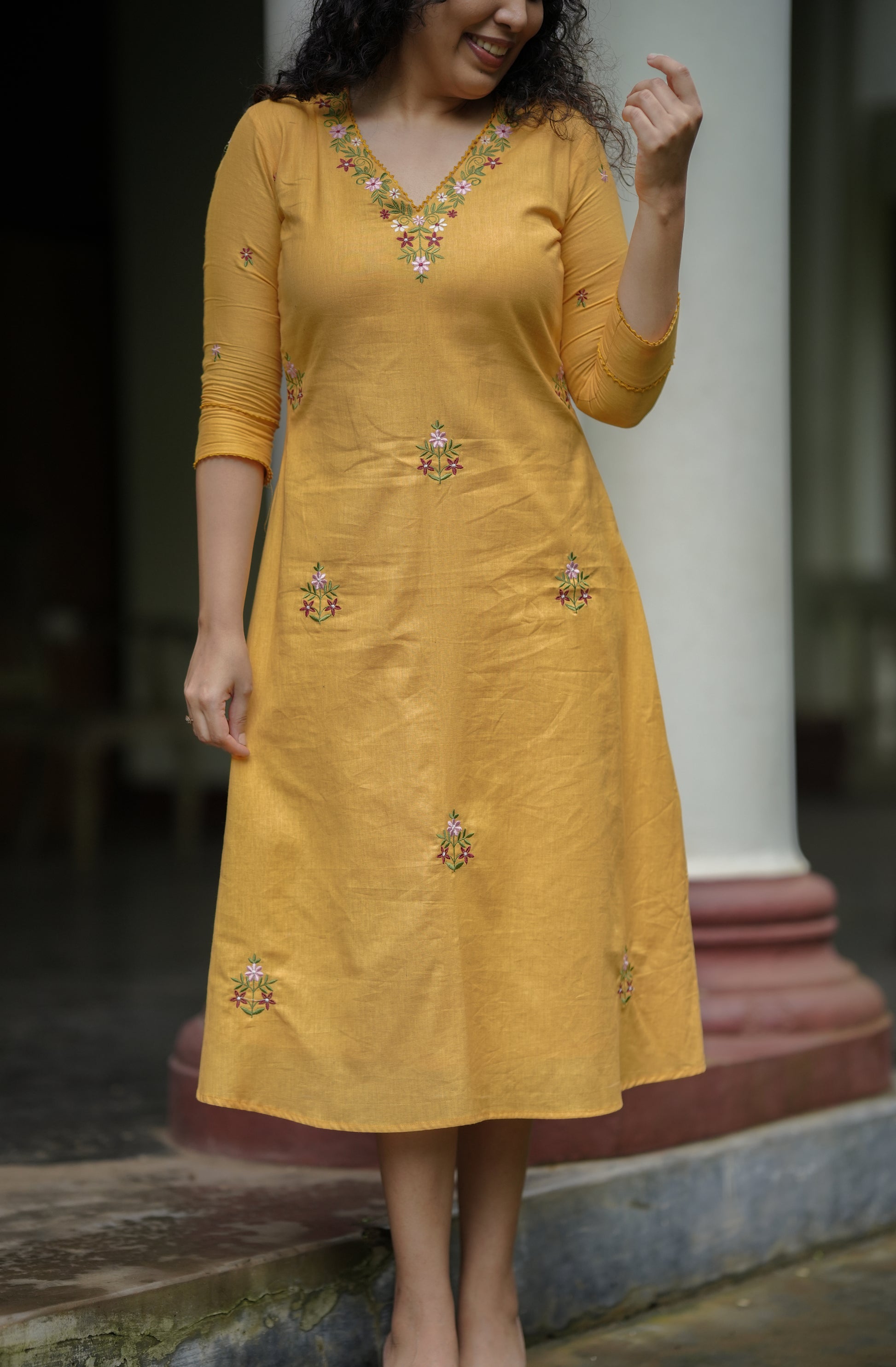 Yellow cotton flex kurti with floral thread embroidery MBS-648