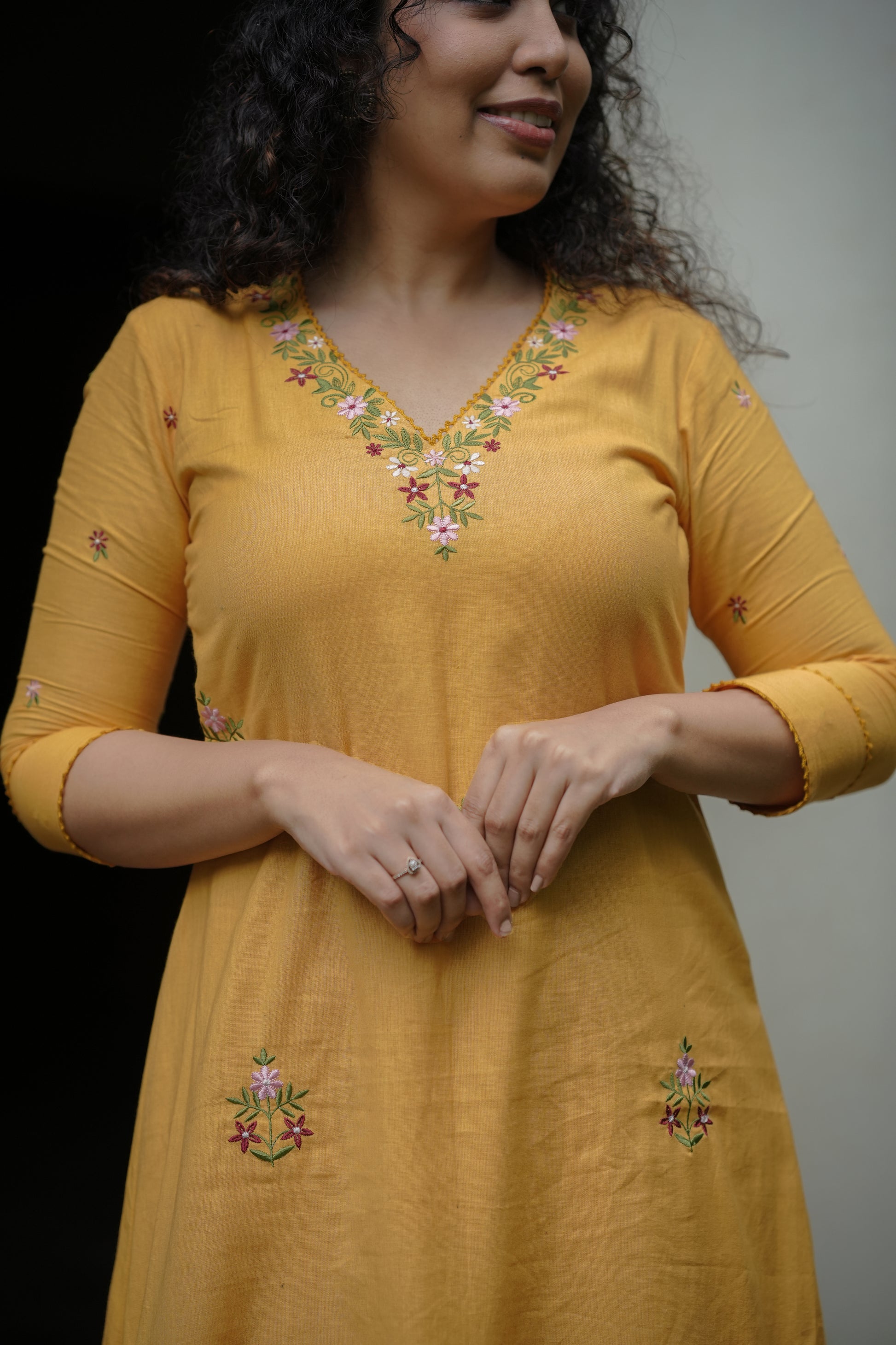 * floral embroidery detailings scattered on front portion