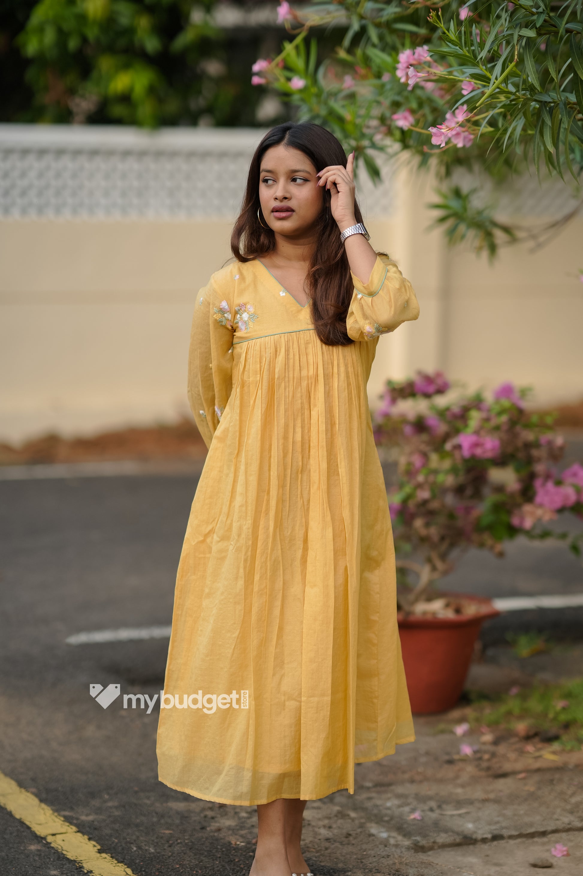 Yellow mul chanderi kurti/dress with floral thread worked yoke and sleeves MBS-838 ***Ready to dispatch***