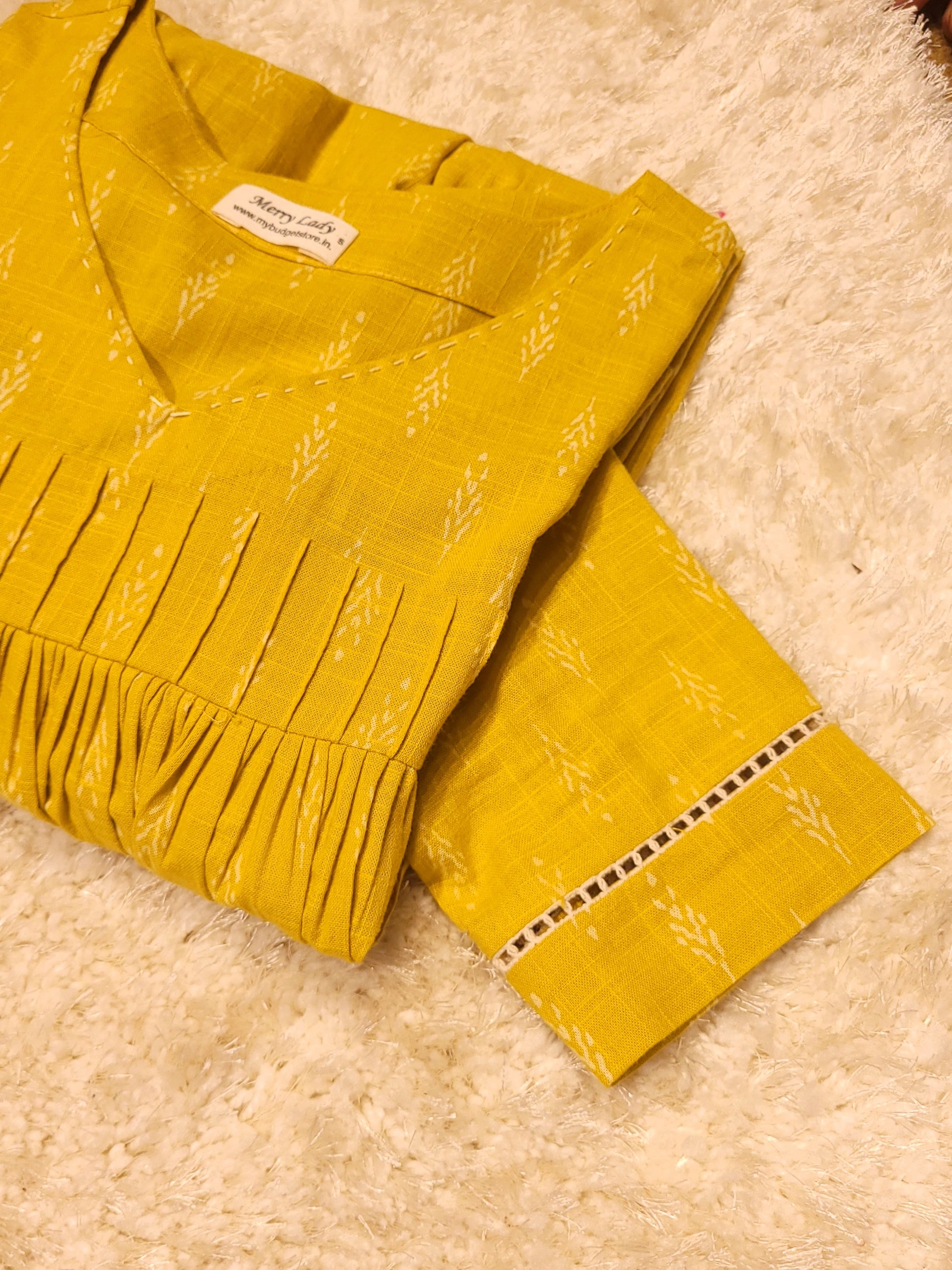 Yellow shaded slub cotton kurti with anchor thread detailed neck and pintucked yoke MBS-786 **ready to dispatch**